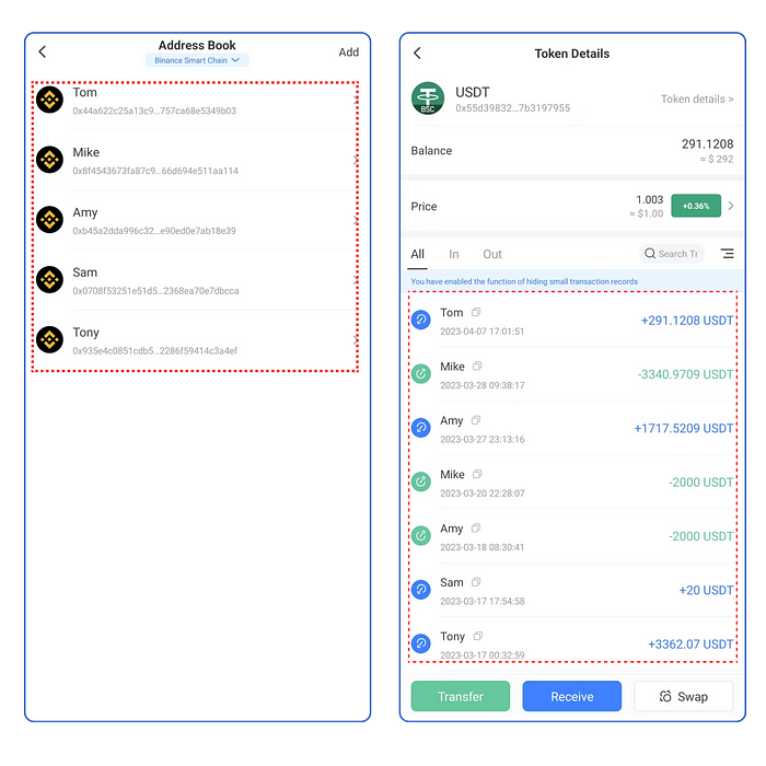 Los fraudes de transferencia de activos cero y de suplantación de direcciones han proliferado, engañando a los usuarios para que copien una “dirección falsa” y asi ejecutar una transferencia. Anteriormente, TokenPocket publicó muchos artículos sobre seguridad y añadió recordatorios de seguridad para copiar direcciones y una función de “ocultar transacciones pequeñas” en la aplicación para ayudar a los usuarios a evitar riesgos en las transferencias.