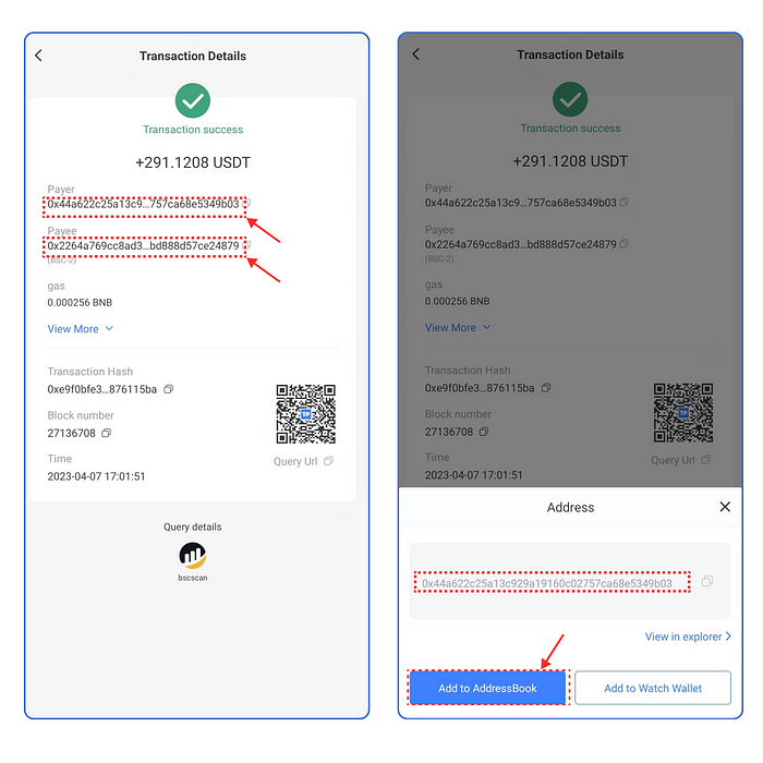 Entrada 2, haga clic en la dirección del monedero en la página de [Detalles de la transacción], a continuación, puede ver la ventana emergente, vuelva a comprobar la dirección del monedero y haga clic en [Añadir a la libreta de direcciones].