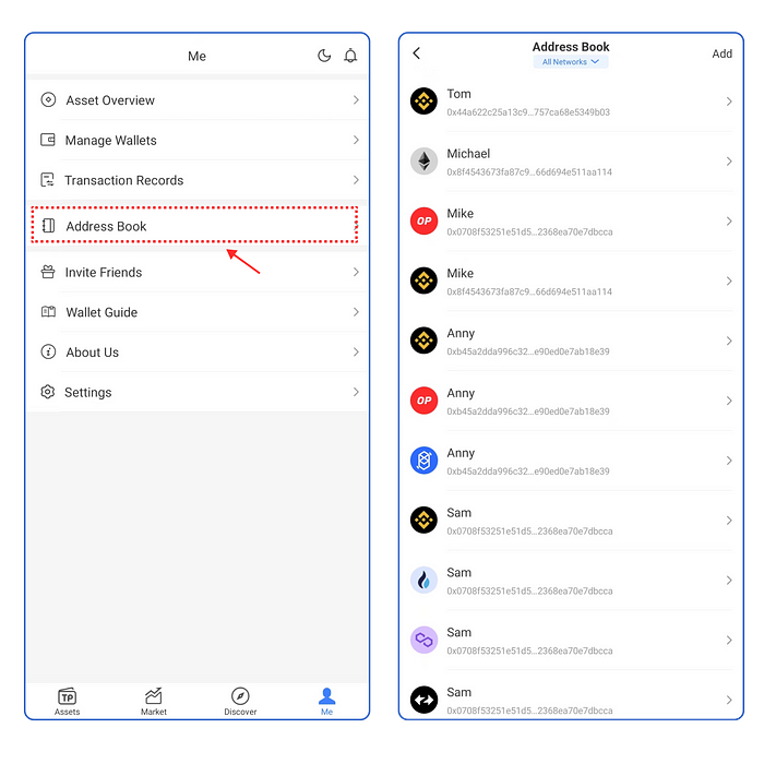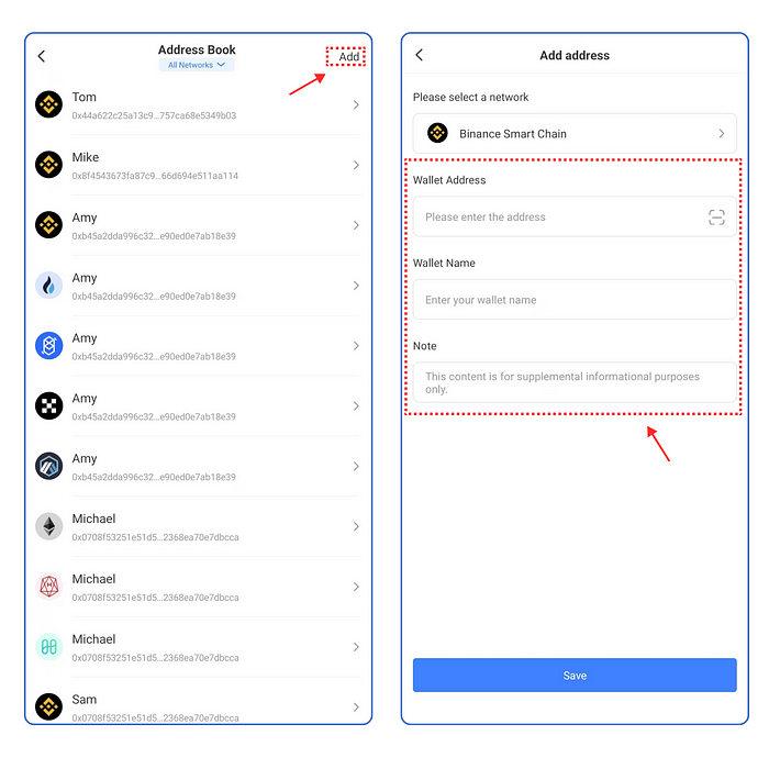 Entrada 3, cambie a [Yo], haga clic en [Libreta de Direcciones], haga clic en [Añadir], entonces entrará en la página de Añadir dirección, puede introducir directamente la dirección de la cartera o escanear la dirección de la cartera para añadirla a la Libreta de Direcciones.
