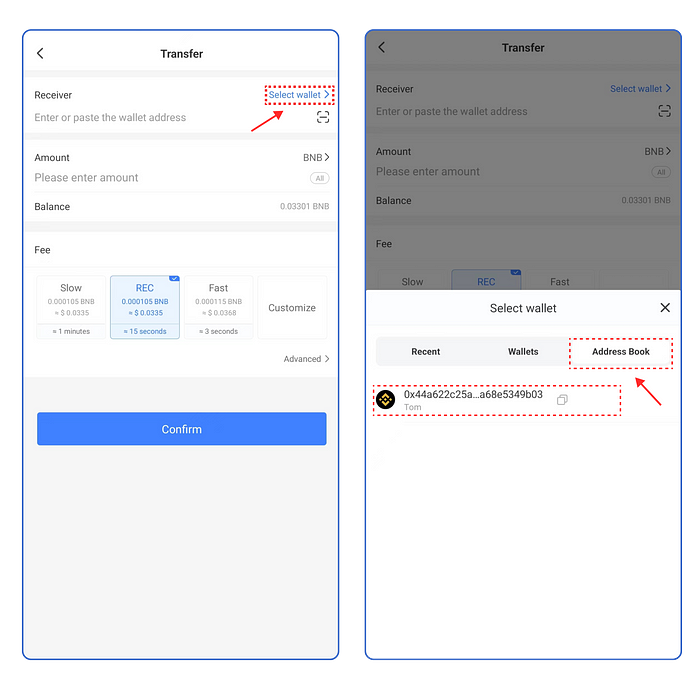 Haga clic en [Seleccionar monedero], cambie a [Libreta de direcciones], seleccione el monedero y, a continuación, podrá ejecutar la operación de transferencia.
