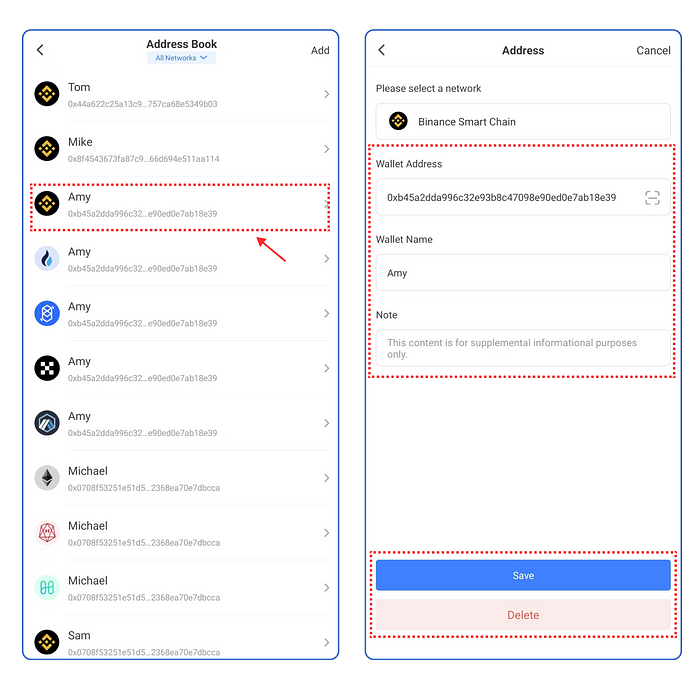 3. Haga clic en la dirección del monedero y, a continuación, en [Editar]. Podrá editar la información de la dirección del monedero y también podrá eliminar esta dirección del monedero en esta página.