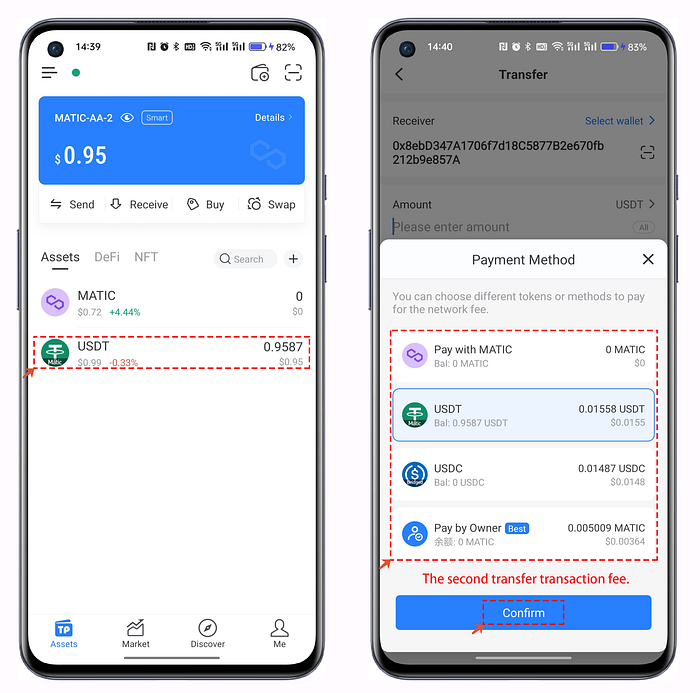 Abre tu TokenPocket AA Wallet, hemos transferido 1 USDT para probar en esta situación. Haga clic en USDT para ejecutar la operación de transferencia e introduzca la dirección de recepción. Puedes ver la cuenta [Pagar con] y seleccionar el método de pago.