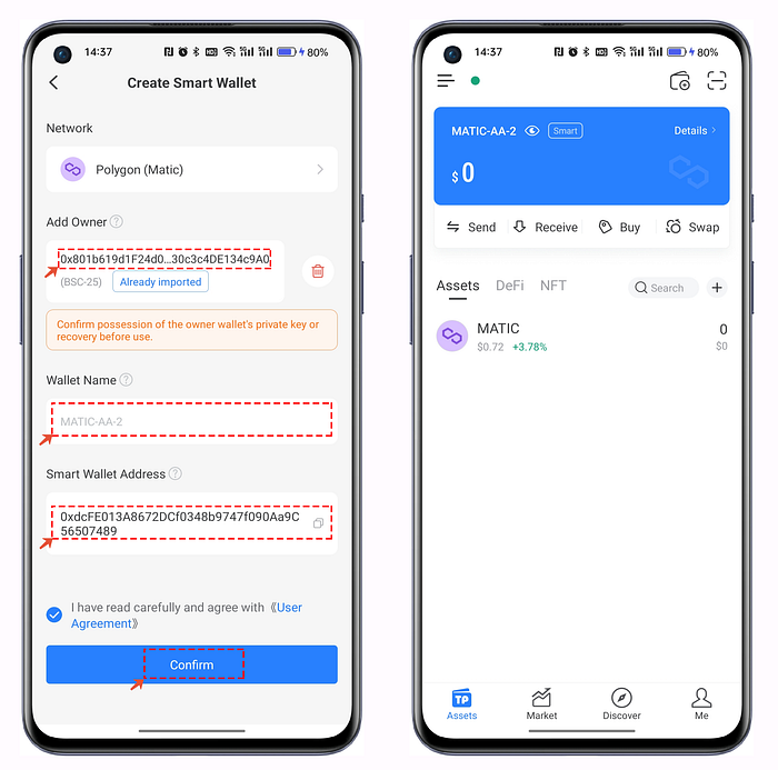 Una vez finalizada la configuración, ya puede obtener su dirección de AA Wallet de inmediato. Personalice el nombre de su monedero, etiquete el Acuerdo de Usuario y haga clic en [Confirmar]. En este punto, has creado con éxito una Cartera AA.