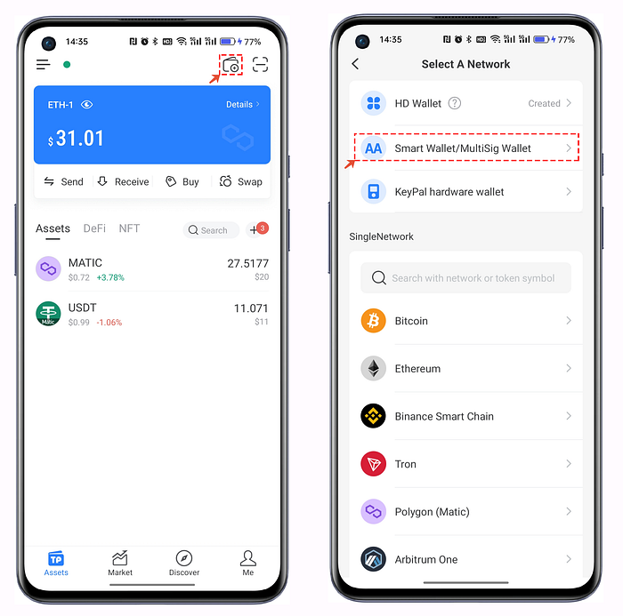 2. Vuelva a la página de Activos, haga clic en la esquina superior derecha y haga clic en [Cartera inteligente/Monedero MultiSig].