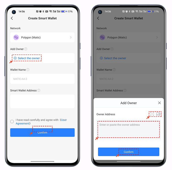 5. Acceda a la página Crear Cartera Inteligente o [Smart Wallet] , seleccione el propietario como dirección para gestionar la cartera, y puede añadir el propietario añadiéndolo desde la lista de carteras, pegándolo o escaneando el código QR. Sólo puede establecer un propietario para gestionar su Cartera AA.