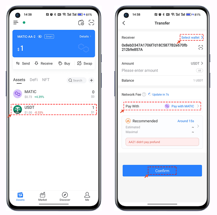 2. Dado que no hay suficiente MATIC en la Cartera AA creada para pagar la comisión de gas, tenemos que considerar otro método de pago. Pagaremos USDT como Gas Fee en este paso.