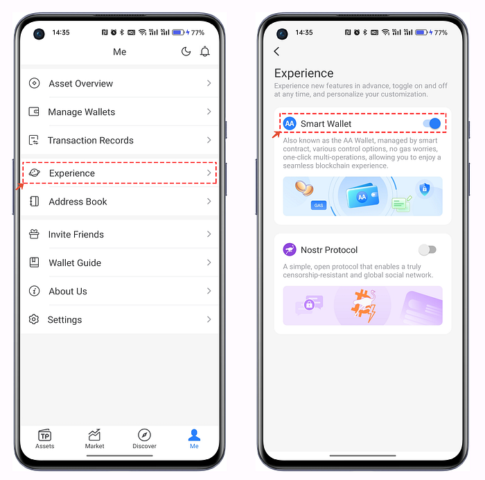 Abre TokenPocket Wallet (asegúrate de haber actualizado a la última versión ), haz clic en [Yo] - [Experiencia]-[Activar la Cartera Inteligente].